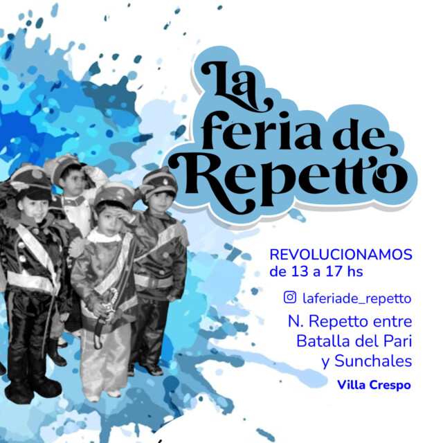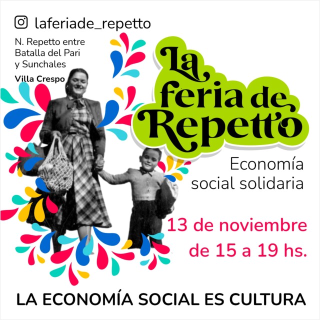 La Feria Cultural de Repetto es un proyecto de la economía social y solidaria que busca fortalecer la cultura comunitaria mediante el desarrollo de un espacio donde las relaciones de producción y distribución giren en torno al principio de solidaridad. Nació a principios de 2021 pos pandemia en el barrio de Villa Crespo (Repetto entre Sunchales y Pari) naciendo del impulso, la invención y la cooperación de Prisma Lúdico, Mecánico Bar y un grupo de vecinos y artistas del barrio y aledaños. Es una propuesta de la economía social y solidaria que busca construir cultura comunitaria